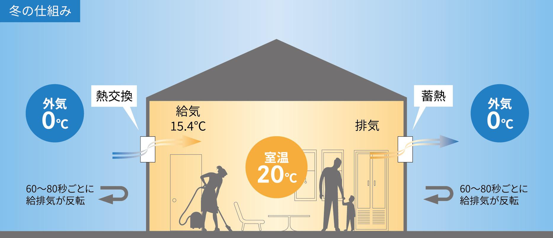 60~80秒ごとにファンの回転方向が変わり、給気と排気が繰り返し行われます。 (交互給排) |